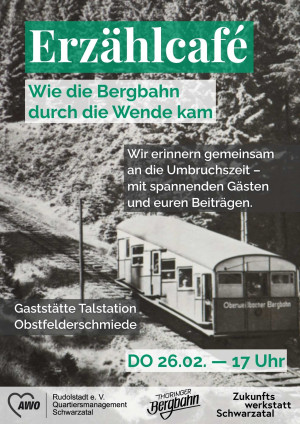 Die politische „Wende“ 1989/90 hat auch im Schwarzatal vieles verändert - manches grundlegend und für immer, anderes hat sich als beständig erwiesen und ist nach 1990 erst richtig „aufgeblüht”. Das betrifft auch die Bergbahn, die zu DDR-Zeiten für viele ein alltägliches Transportmittel zur Arb… Die politische „Wende“ 1989/90 hat auch im Schwarzatal vieles verändert - manches grundlegend und für immer, anderes hat sich als beständig erwiesen und ist nach 1990 erst richtig „aufgeblüht”. Das betrifft auch die Bergbahn, die zu DDR-Zeiten für viele ein alltägliches Transportmittel zur Arbeit und für die tausenden Touristen eine zentrale Attraktion war. Heute nutzen die meisten - Einheimische wie Gäste - das Auto zur Fortbewegung. Die Bergbahn gibt es aber immer noch, was wesentlich den engagierten Akteuren  damals wie heute zu verdanken ist.Mit unserem Erzählsalon am 26. Februar wollen wir diese Zeit mit einigen der damals besonders aktiven Engagierten noch einmal erinnern. Mit dabei sind u.a.  - Ingo Schneider, heute dienstältester Mitarbeiter der Oberweißbacher Berg- und Schwarzatalbahn - Evi Botz, zur Wendezeit Bürgermeisterin in Lichtenhain/Bergbahn - Karola Schneider, von 1980 bis 2020 im Einsatz an verschiedenen Bahnstationen - Peter Möller, Bergbahnchef von 2002 bis 2015 Wir laden herzlich ein und würden uns über weitere Beiträge zum Thema freuen!